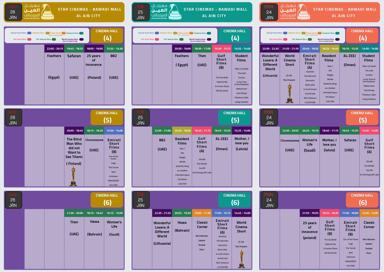 Film Screening: – Location: Star Cinema at Bawadi Mall in Al Ain city. – Date: 24-25-26 Jan 2022 from 2pm till 10pm. – Tickets: collection from Bawadi Star Cinema at AFF counter (Tickets are free), all ticket booking opens 30 minutes only before the show.